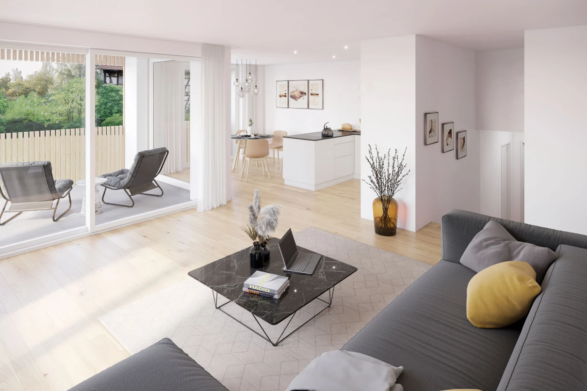 In einem stilvollen Anbau an ein früheres Dorfrestaurant entsteht diese moderne 4.5-Zimmer-Wohnung. Ein gelungener Mix aus ländlichem Charakter und zeitgemässem Wohnkomfort.