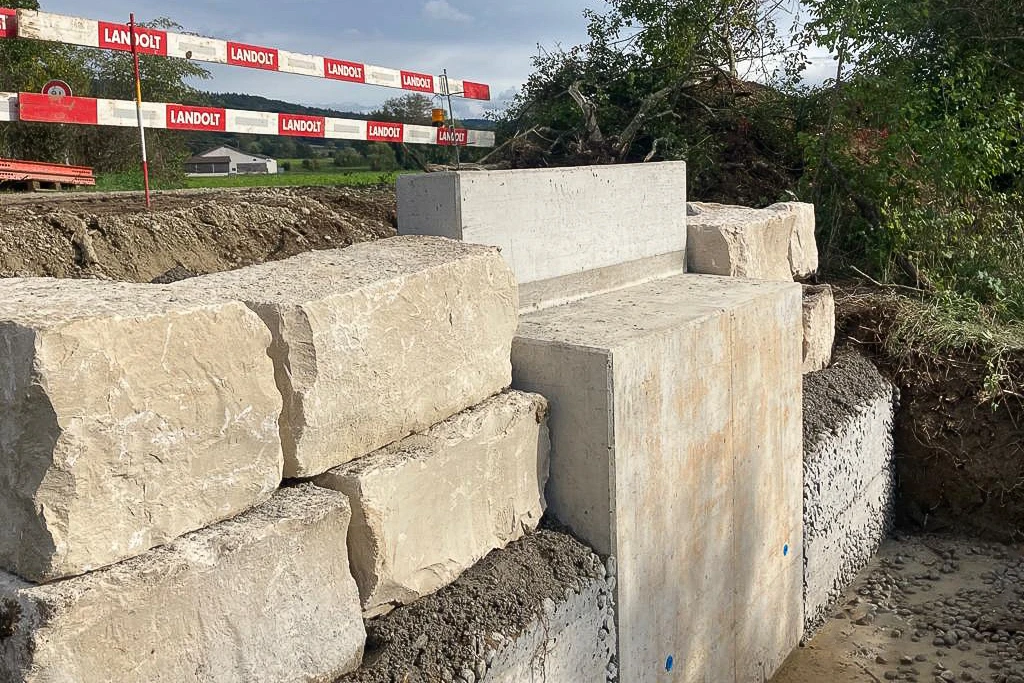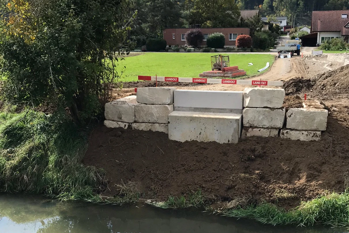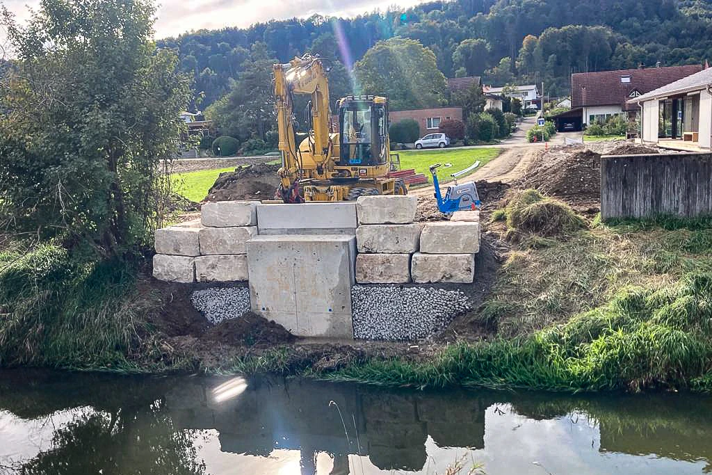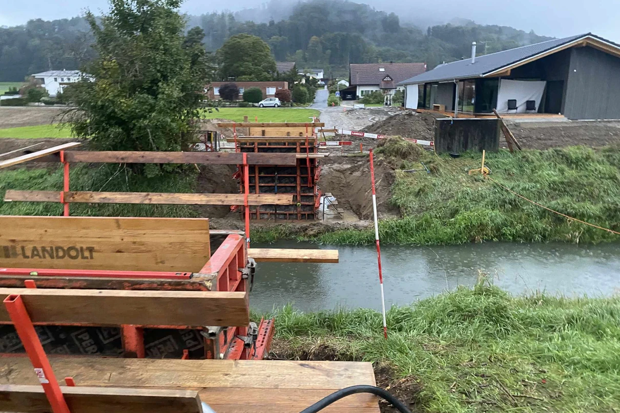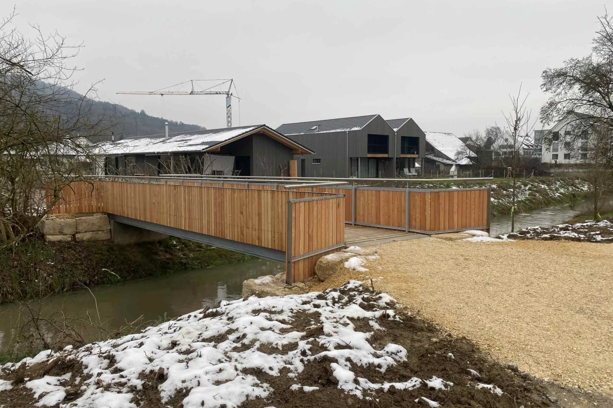 Die neue Fussgängerbrücke in Ramsen überwindet den Fluss Biber. Sie hat eine Spannweite von 16 m und eine Breite von fast 2 m. An beiden Ufern wurden massive Betonfundamente erstellt, welche mit Stahlträgern verbunden wurden.