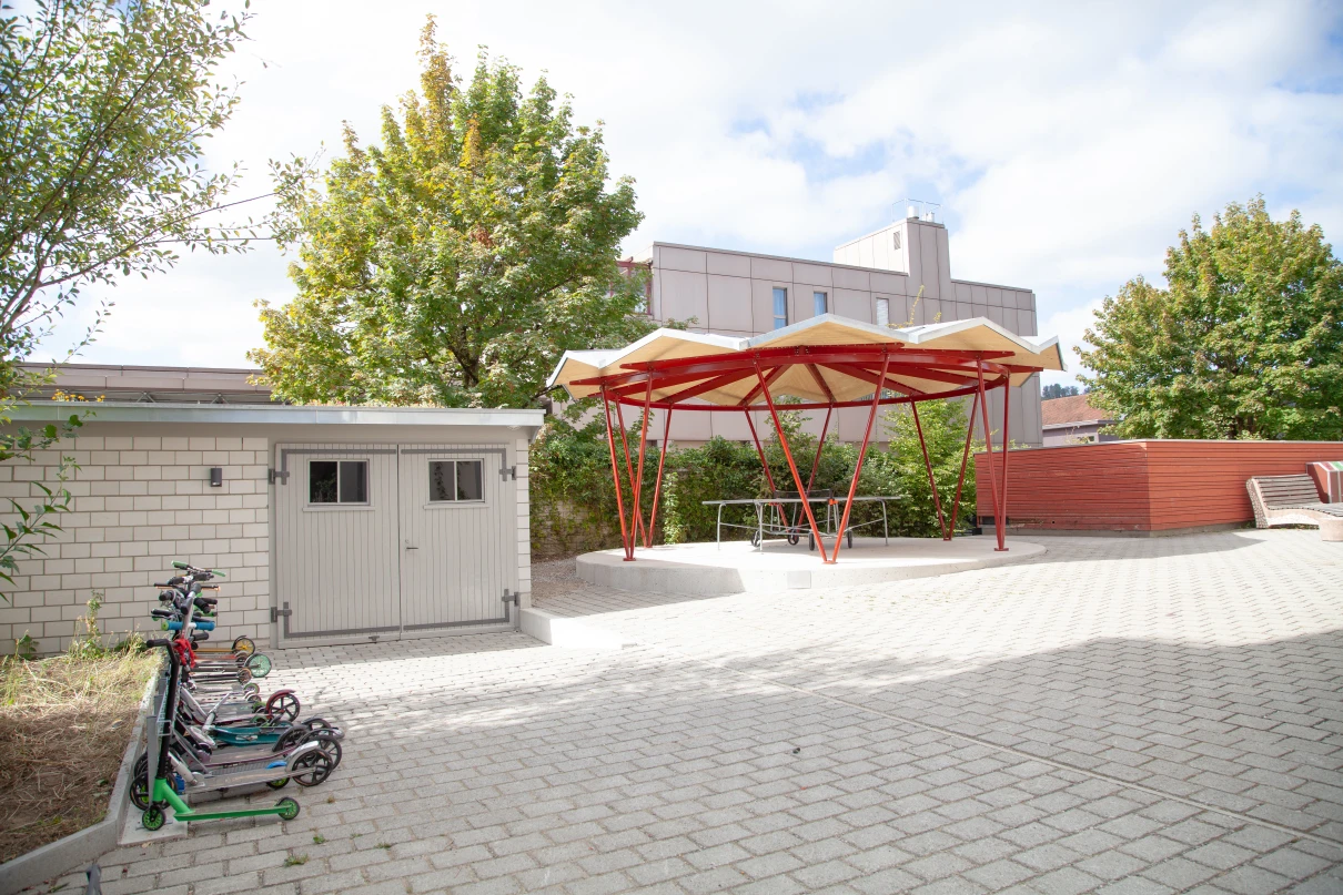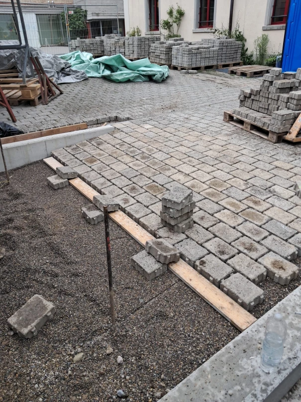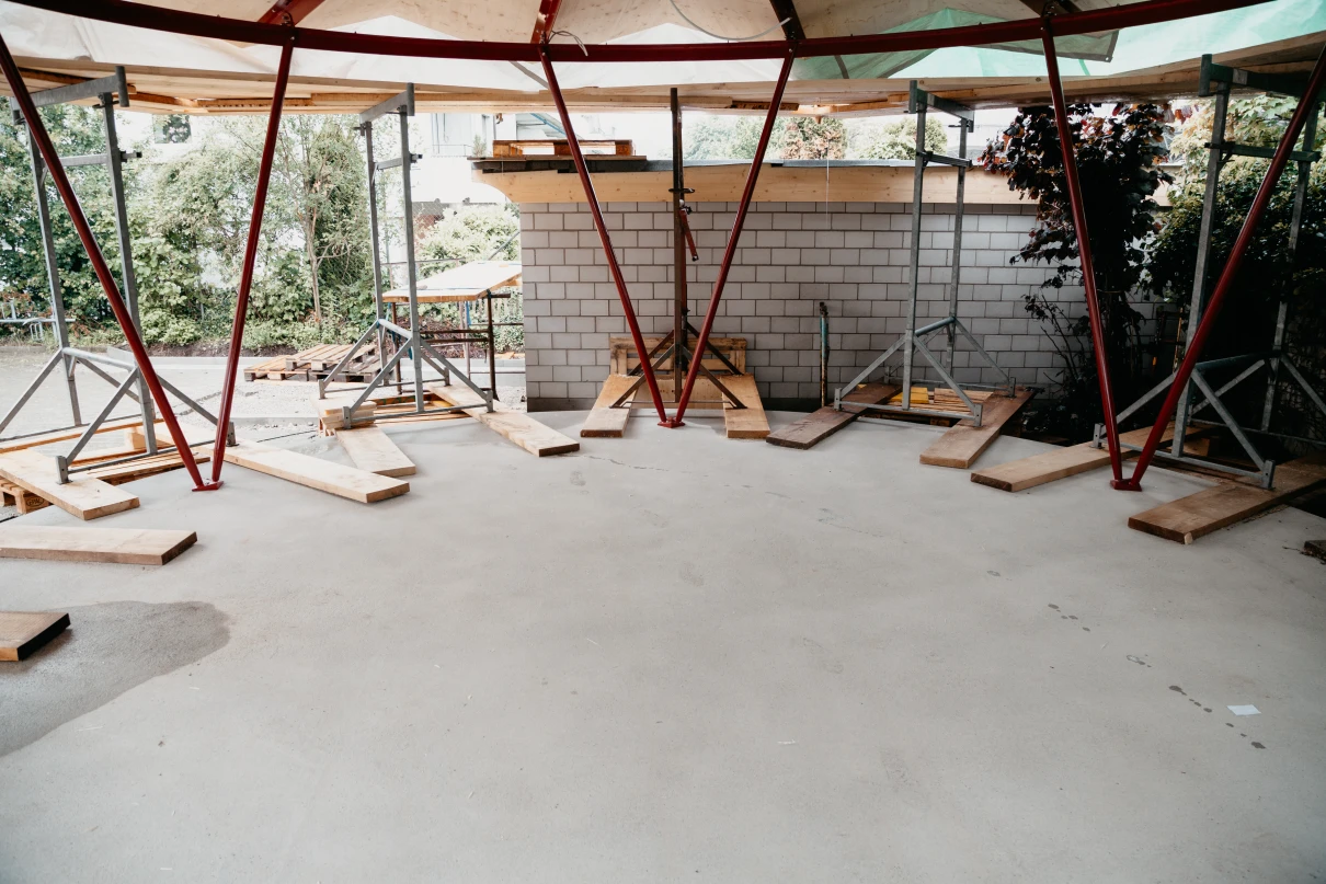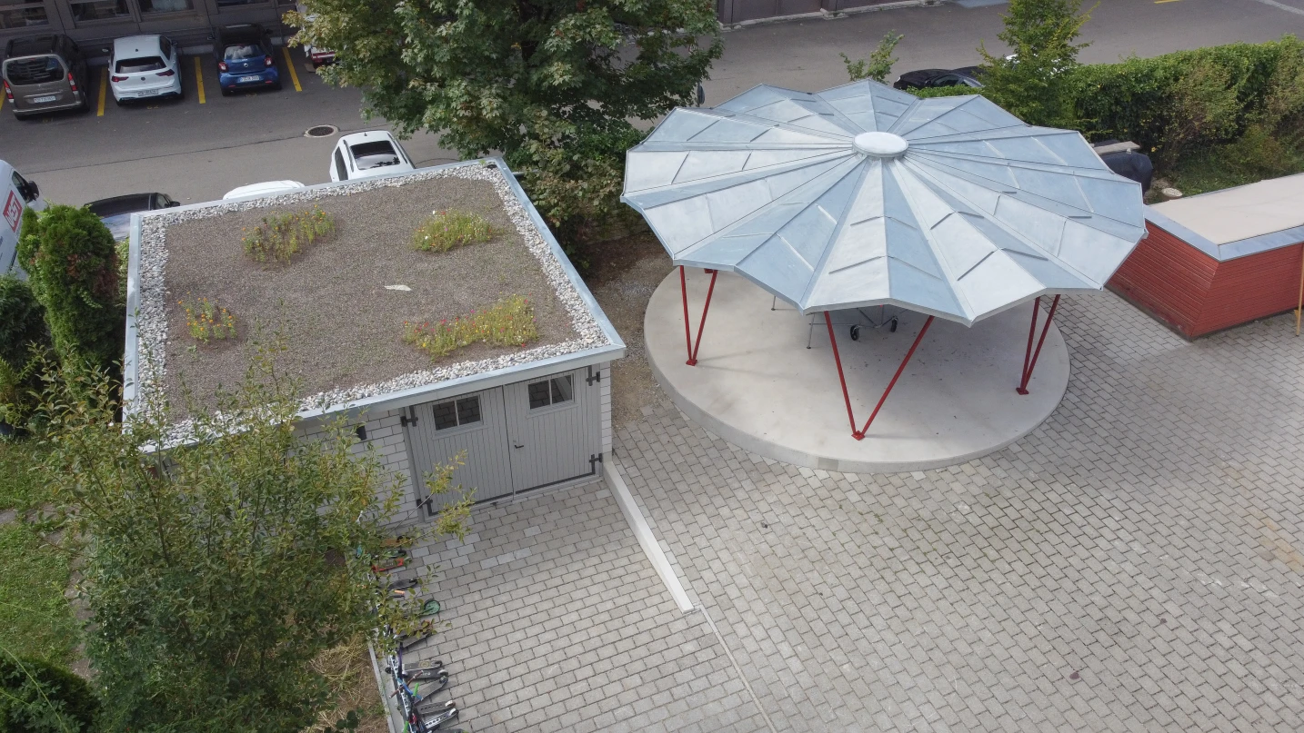 Im Schulhof der Rudolf Steiner Schule Winterthur durften wir eine Betonplattform sowie zusätzliche Um- und Ergänzungsarbeiten realisieren. Die runde Betonplattform dient zur Befestigung der Stahlkonstruktion und des gefalteten Holzdachs. Der Unterstand soll in Zukunft zum Verweilen und Spielen in den Schulpausen dienen und kann auch für andere Schulanlässe verwendet werden. Der daneben liegende Lagerraum wurde mit einer neuen Bodenplatte ausgestattet, und das Mauerwerk teilweise angepasst. Vor dem Lagerraum wurde ein Betonfundament erstellt, auf welchem ein Kickboardständer angebracht wurde. Zu guter Letzt führten wir die Ergänzungsarbeiten der Verbundsteine durch und versetzten neue Stellriemen.