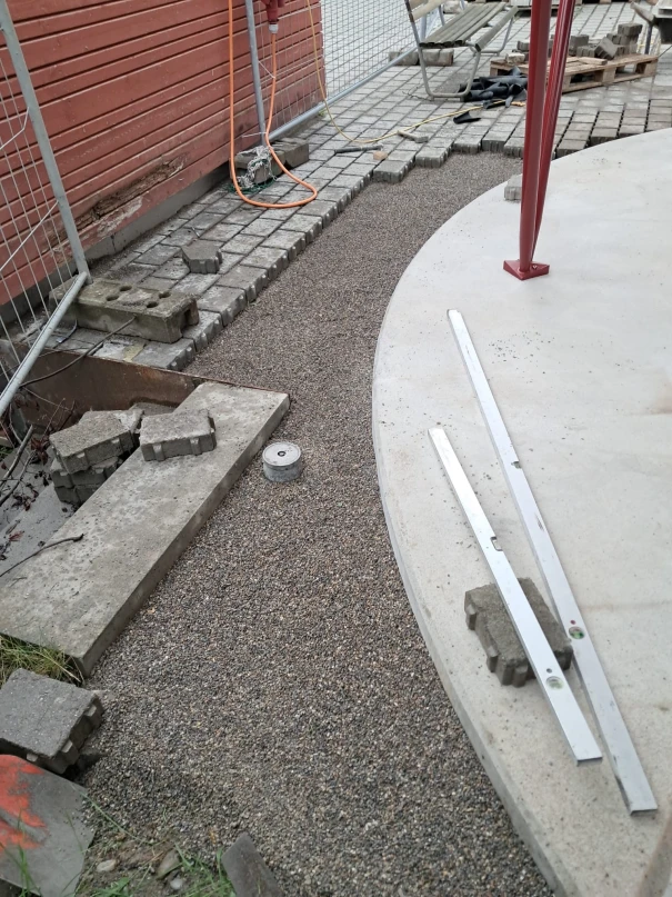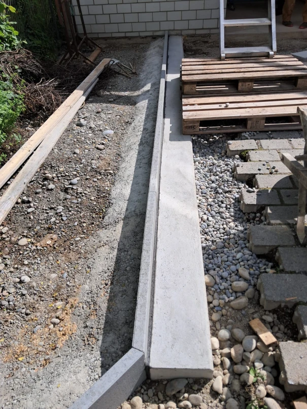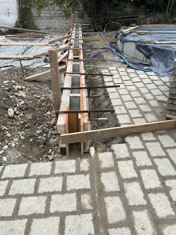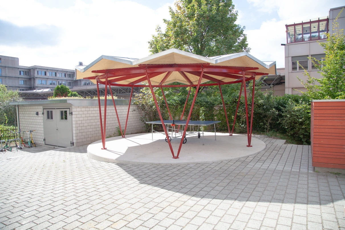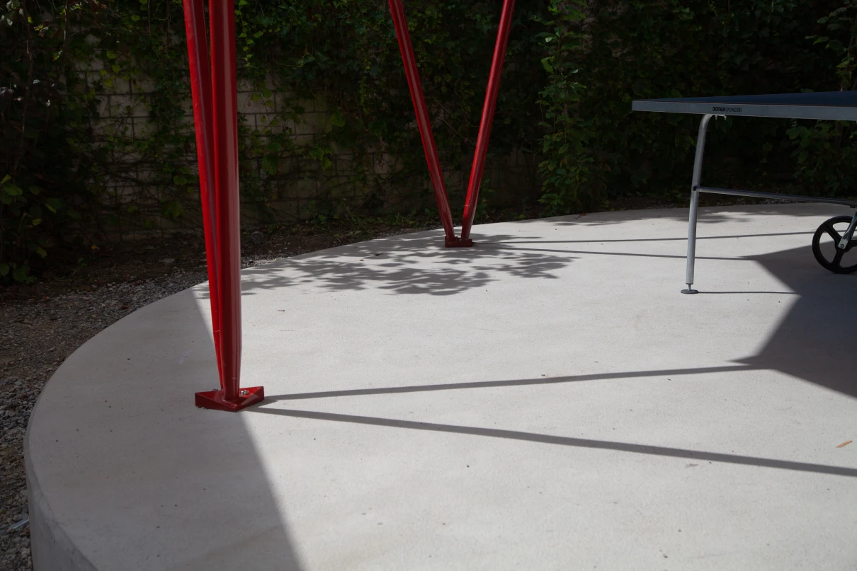 Im Schulhof der Rudolf Steiner Schule Winterthur durften wir eine Betonplattform sowie zusätzliche Um- und Ergänzungsarbeiten realisieren. Die runde Betonplattform dient zur Befestigung der Stahlkonstruktion und des gefalteten Holzdachs. Der Unterstand soll in Zukunft zum Verweilen und Spielen in den Schulpausen dienen und kann auch für andere Schulanlässe verwendet werden. Der daneben liegende Lagerraum wurde mit einer neuen Bodenplatte ausgestattet, und das Mauerwerk teilweise angepasst. Vor dem Lagerraum wurde ein Betonfundament erstellt, auf welchem ein Kickboardständer angebracht wurde. Zu guter Letzt führten wir die Ergänzungsarbeiten der Verbundsteine durch und versetzten neue Stellriemen.