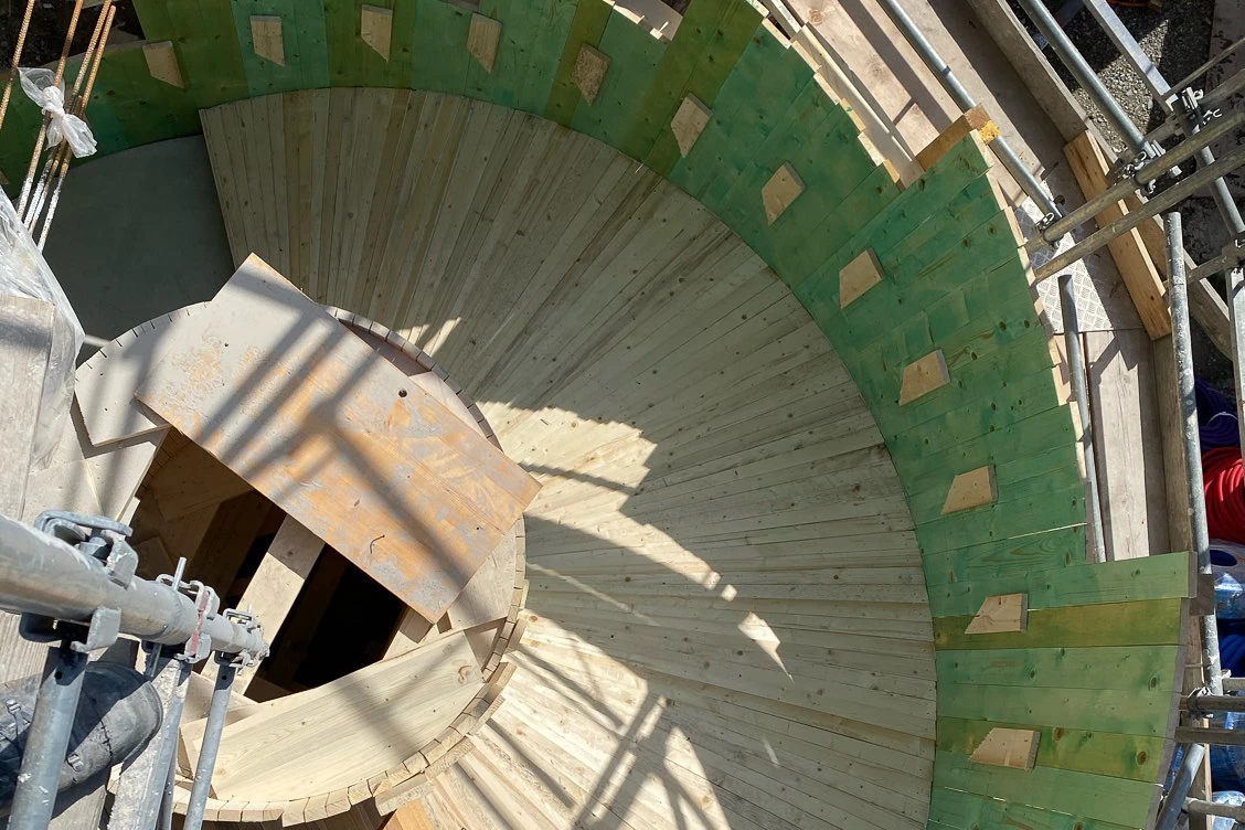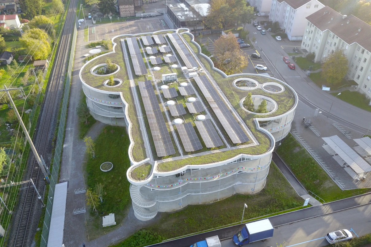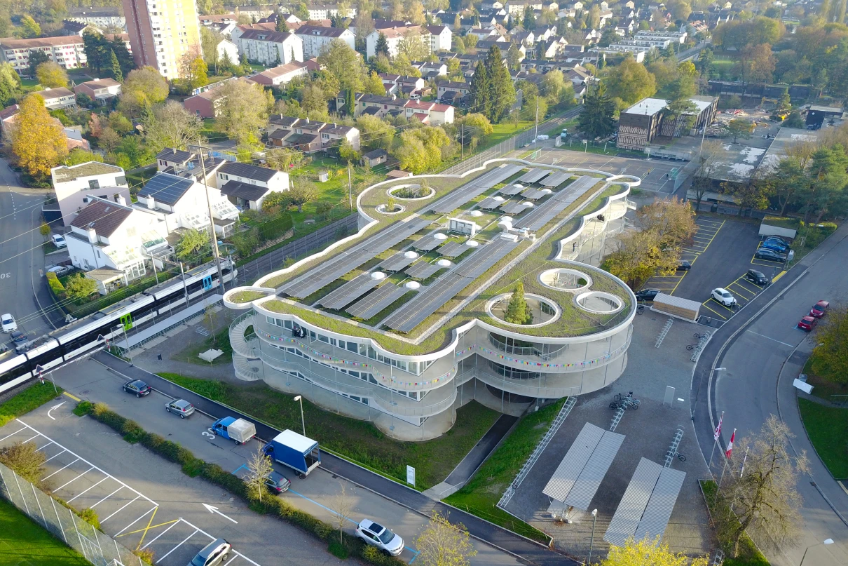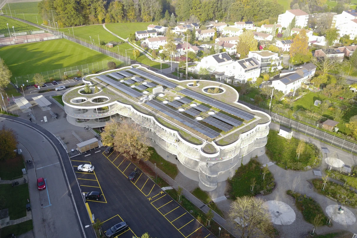 Das Schulhaus Wallrüti ist ein dreigeschossiger Pausen- und Lernbereich in Form umlaufender wolkenförmiger Laubengänge mit hängender Gärtenbepflanzung, welche die Relation des Klassenzimmers zum Aussenraum neu als Freiluftschule definiert.