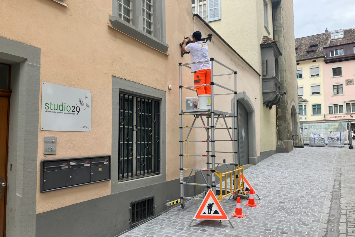 Für Kundenarbeiten der Heinz Kern AG war es wieder einmal ein super Jahr. Wir hatten sehr viele Aufträge, wo wir unser handwerkliches Geschick so richtig auf die Probe stellen konnten. Zuhause in historischen Altstätten entlang des Rheins, konnten wir zum Beispiel für die Stadt Schaffhausen die Stadtbeleuchtung Instand setzen und neue Sicherheitskameras montieren. Die Bilder sprechen für sich! Aber auch in Diessenhofen und Stein am Rhein konnten wir diversen Privathäusern einen neuen Schliff verpassen. Dabei kann es auch mal vorkommen, dass man wieder wie Ano dazumal Sumpfkalk anrühren und mit den feinsten Pigmenten das Städtchen Stein am Rhein in Schuss halten darf. Ein Privileg, dass unsere Mitarbeiter mit Stolz zum Besten bringen.