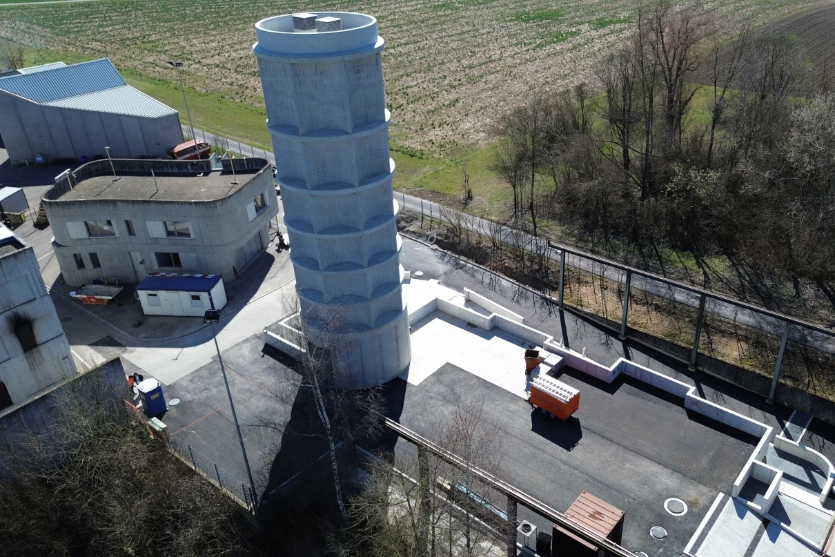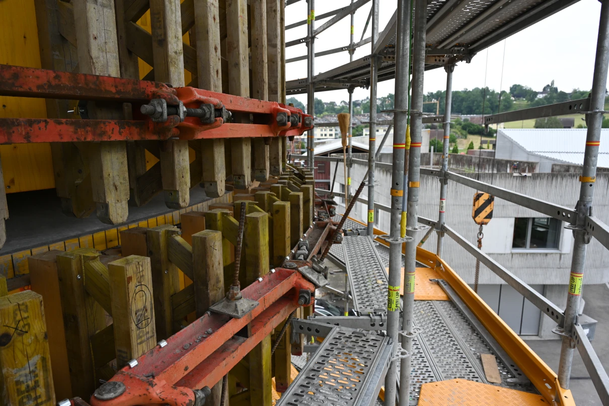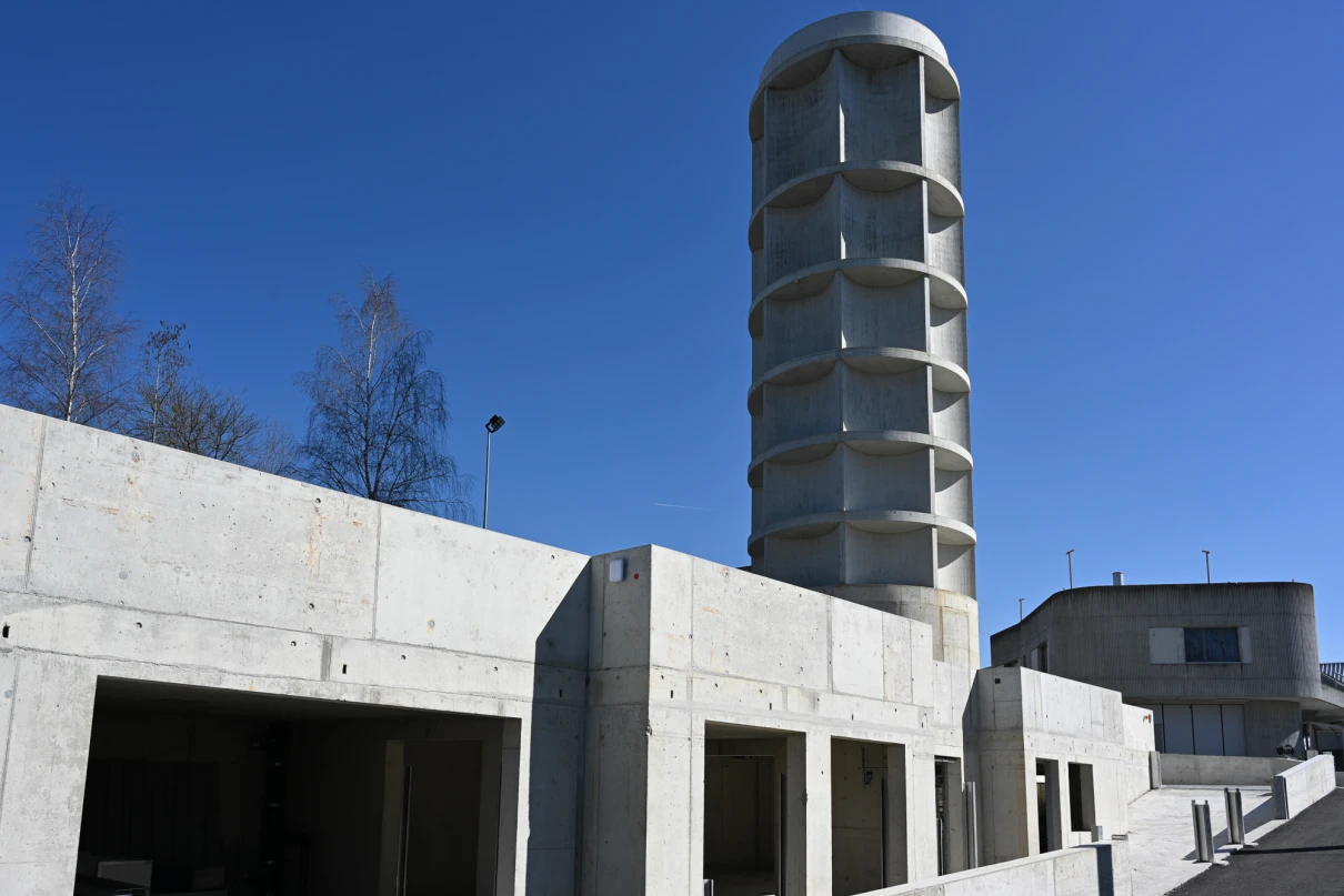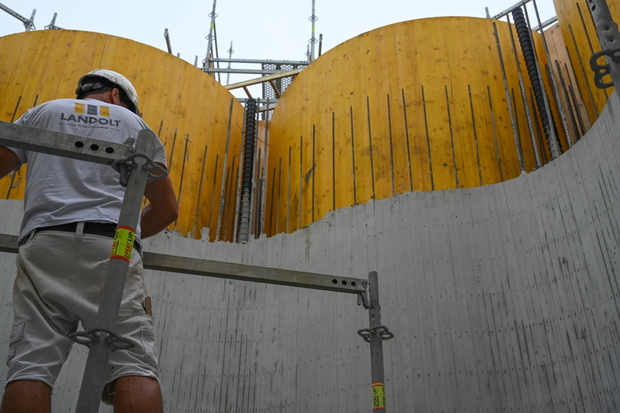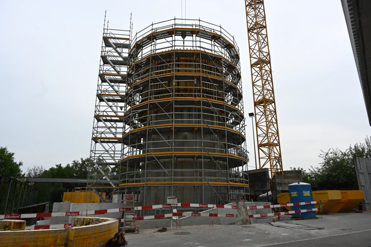 Für das Ausbildungszentrum Andelfingen bauen wir eine Flutungsanlage mit einem 23m hohen Wasserturm. Die Anlage wird genutzt um Ernstfälle rund ums Thema Überflutungen zu trainieren. 350 Kubikmeter Wasser kann der Turm fassen, um die fünf Kammern, sowie die Rampe zu fluten. Mit komplexen Pumpsystem wird das Wasser nach Beendung der Übung wieder zurück in den Turm gepumpt. Um der anspruchsvollen Geometrie des Wasserturms gerecht zu werden, wurde ein Schalungskonzept in Zusammenarbeit mit Peri AG ausgearbeitet.