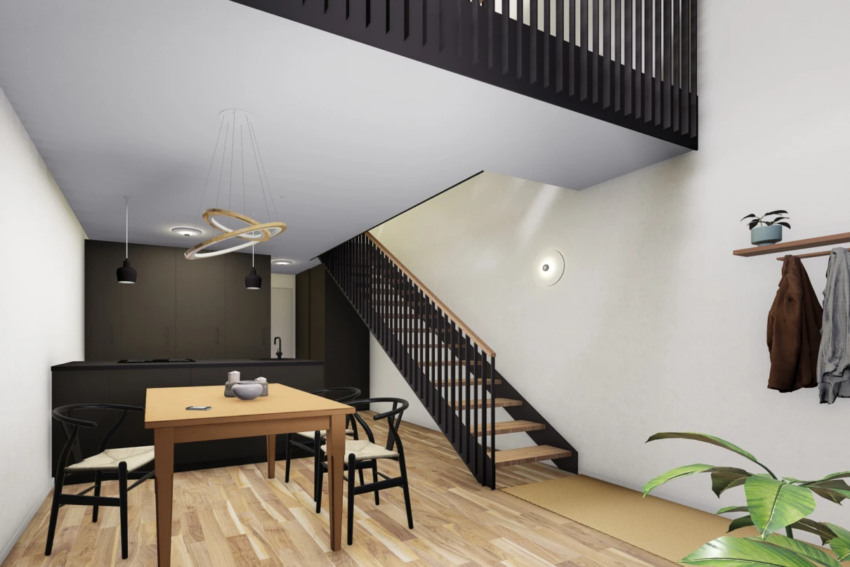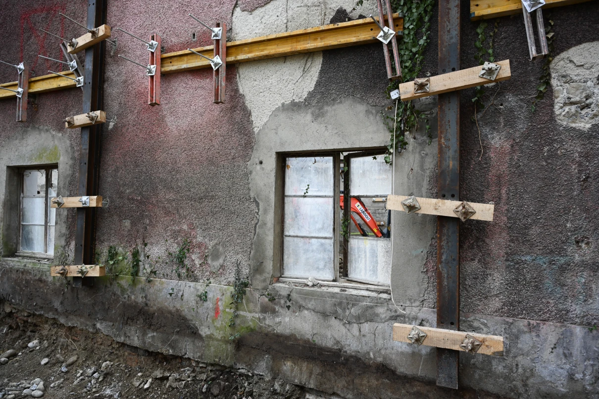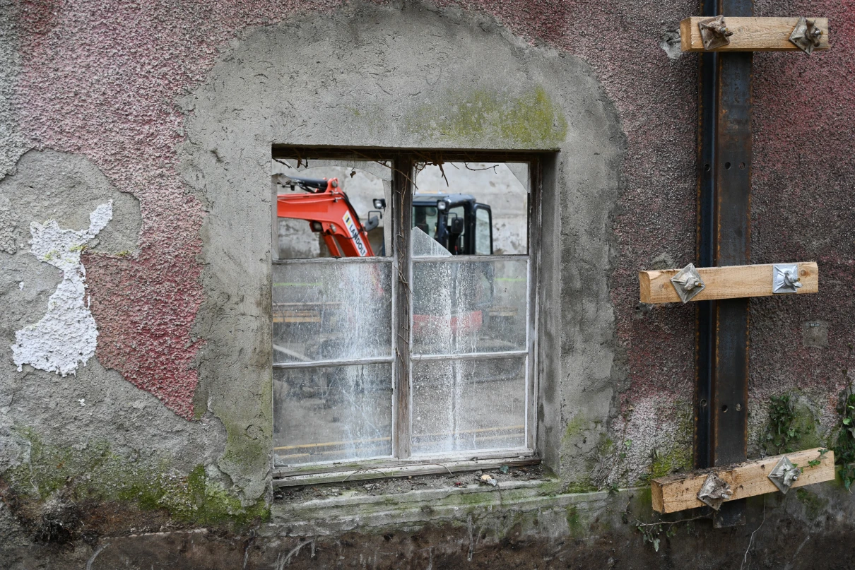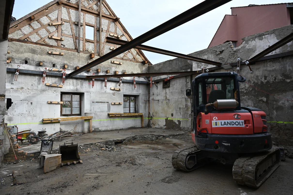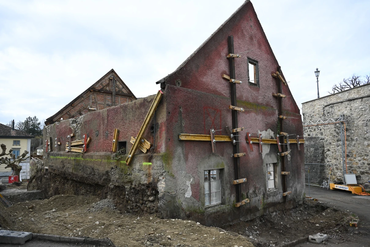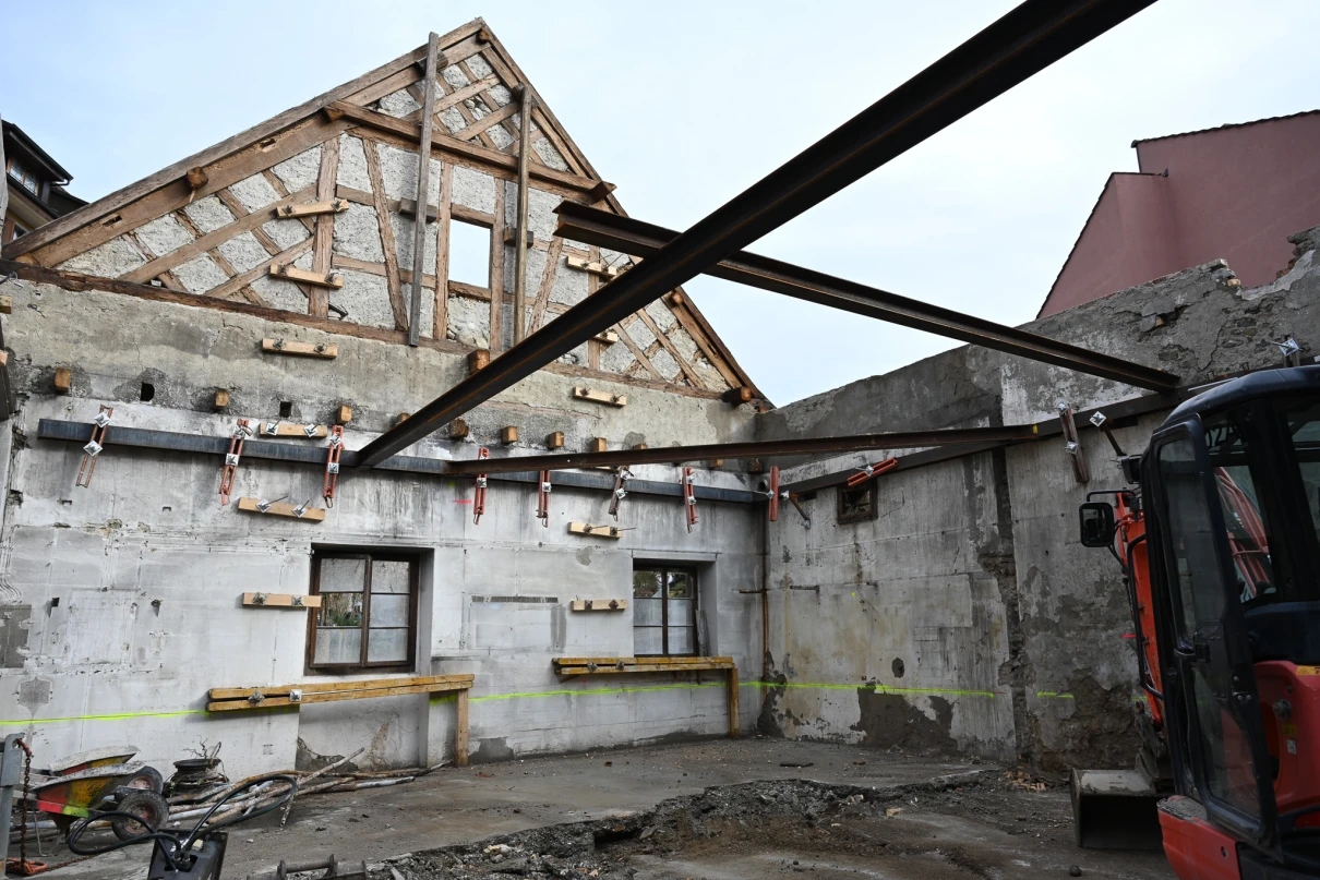 Die Fassade erhält einen Kellenwurfputz , das Dach bekommt eine Biberschwanzeindeckung und vor die grosse Fensterfront werden Holzlamellen vorgehängt, damit die alte Charakteristik erhalten bleibt.
