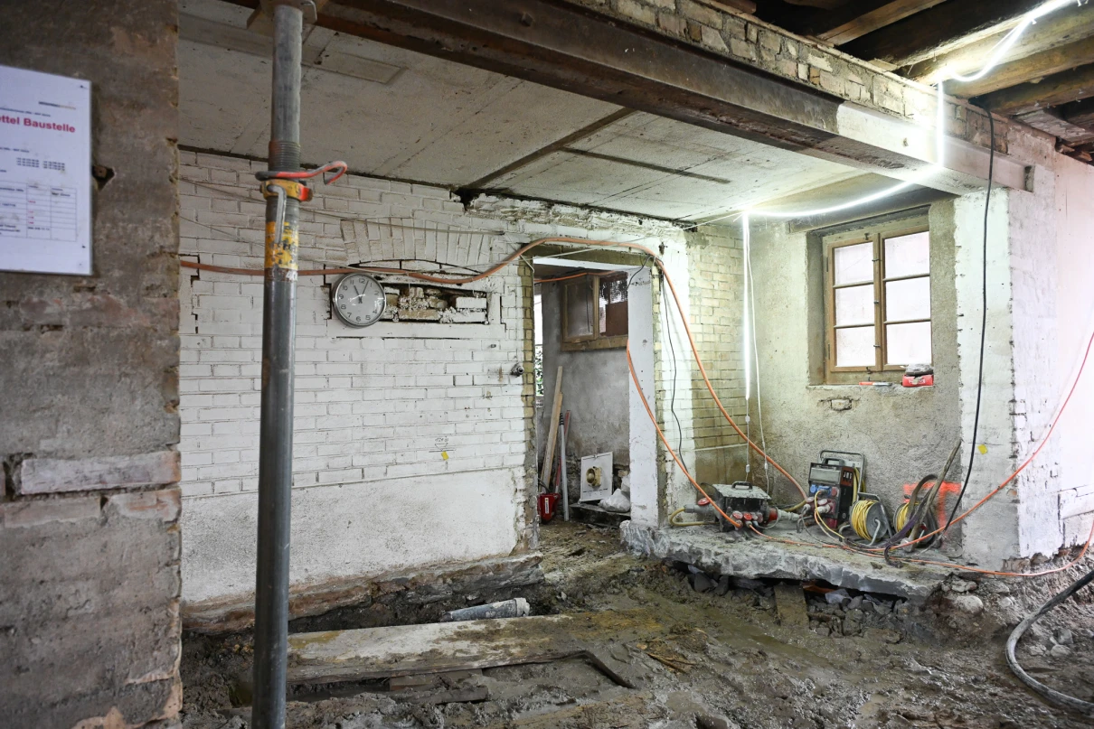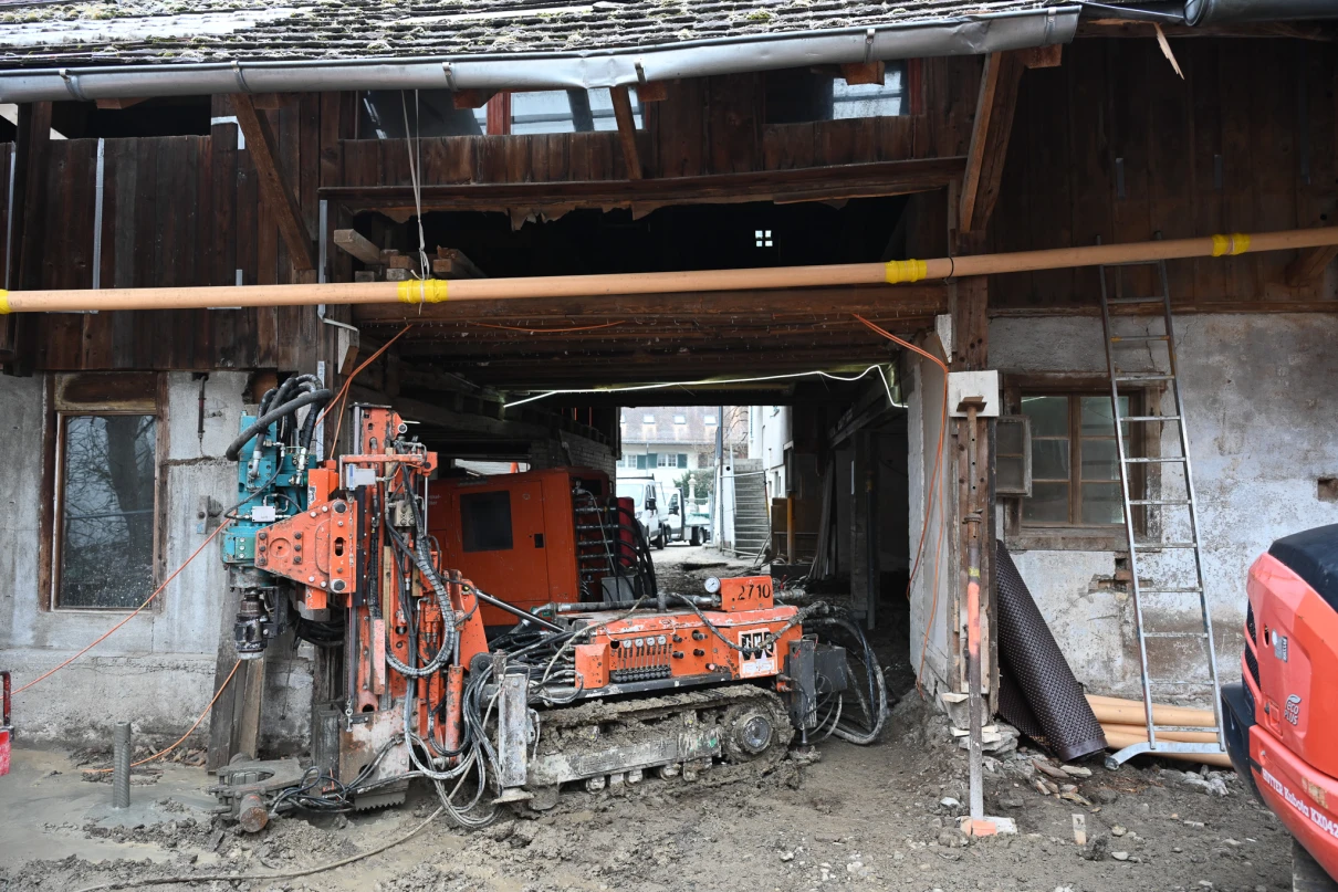 Die Aussenwände sowie der gesamte obere Dachboden dieser historischen Scheune stehen unter Denkmalschutz, weshalb ihre Sanierung eine besondere Herausforderung darstellt. Mit viel Sorgfalt und teils maschineller Unterstützung wird das Gebäude aufwendig renoviert. Besonders faszinierend ist, welche Entdeckungen im Erdreich gemacht werden. So wurde während der Pfählungsarbeiten das Skelett eines Pferdes gefunden, was zu weiterführenden archäologischen Untersuchungen führte. Zudem wurde ein altes Güllenloch freigelegt, abgebaut und fachgerecht entsorgt.